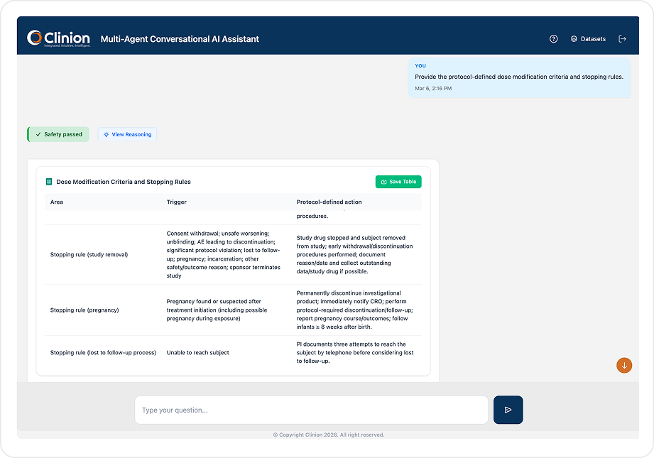Ask any protocol question in plain English. Agentic Assistant retrieves precise, citation-backed answers from your study-specific knowledge base with full traceability to the original protocol section.